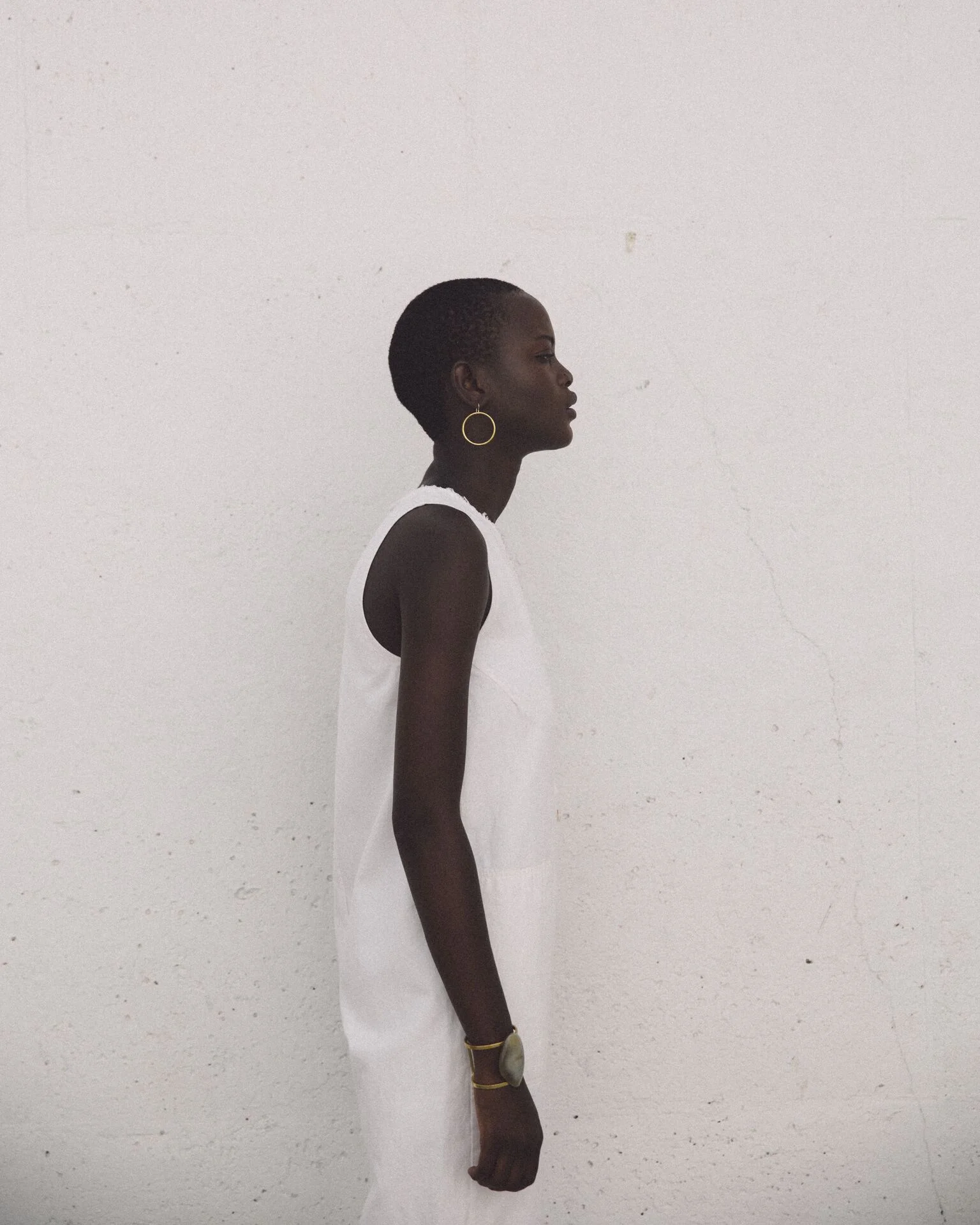 Raw Finish Button-Up Jumper in White + SOKO Earrings and Bracelet.